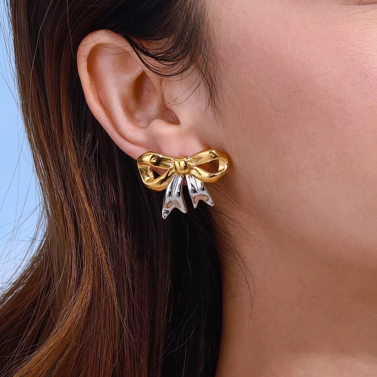Crafted with 18k gold coated stainless steel, these Two Tone Bows are not only stylish but also hypoallergenic and waterproof. Perfect for those with sensitive skin or for everyday wear, these bows offer timeless elegance and durability. Experience high-quality jewelry at an affordable price.